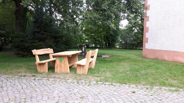 Gefördert durch das Kleininfrastrukturprojekt „Wander- und Pilgerland Sachsen“ der Wander- und Pilgerakademie Sachsen konnte dieser Platz durch Bänke und Tisch der sächsischen Firma Ziegler gestaltet werden. Unter dem Aspekt der Nachhaltigkeit und Regionalität war uns wichtig, dass Firma Ziegler ihren Sitz im Landkreis Leipzig hat.