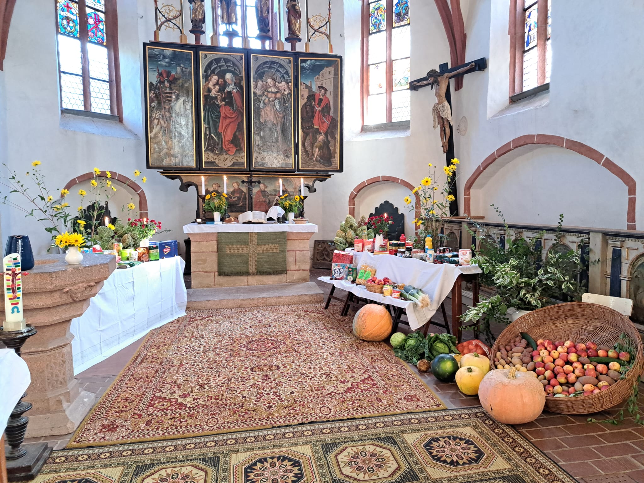 Impression vom Erntedankfest am Sonntag, 29. September 2024. Beide Kirchen waren schön geschmückt mit Blumen und Erntedank-Gaben, für die die Leipziger OASE, Ökumenische Kontaktstube für Wohnungslose in der Nürnberger Straße sehr dankbar war. Die Spenden helfen, den Gästen der Oase Mahlzeiten anzubieten und sie sonst in vielerlei Hinsicht zu unterstützen.